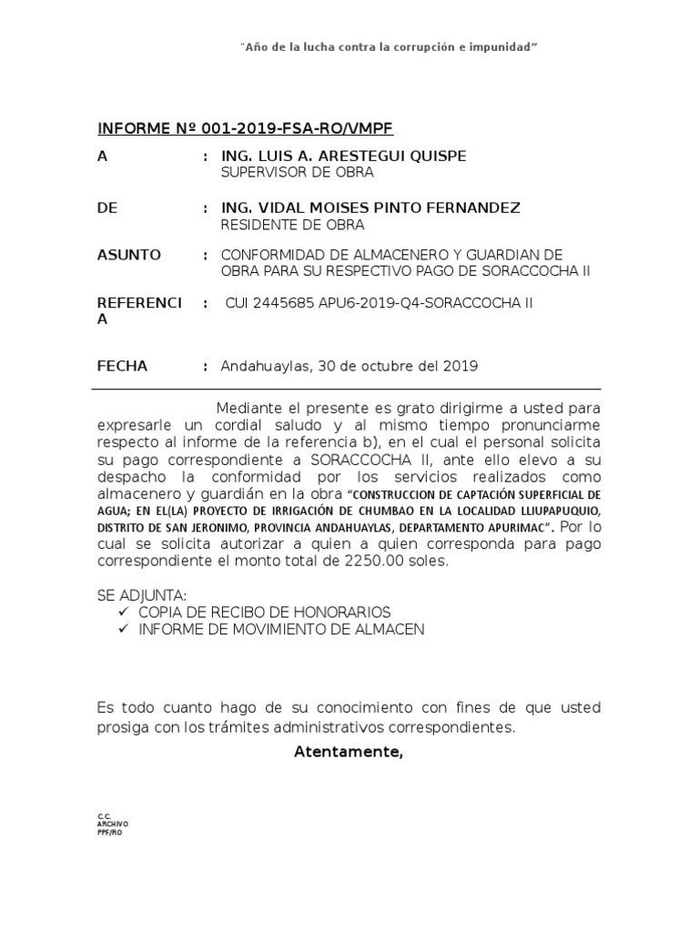 Informe Conformidad Residente A Supervisor Pdf Gobierno Violencia